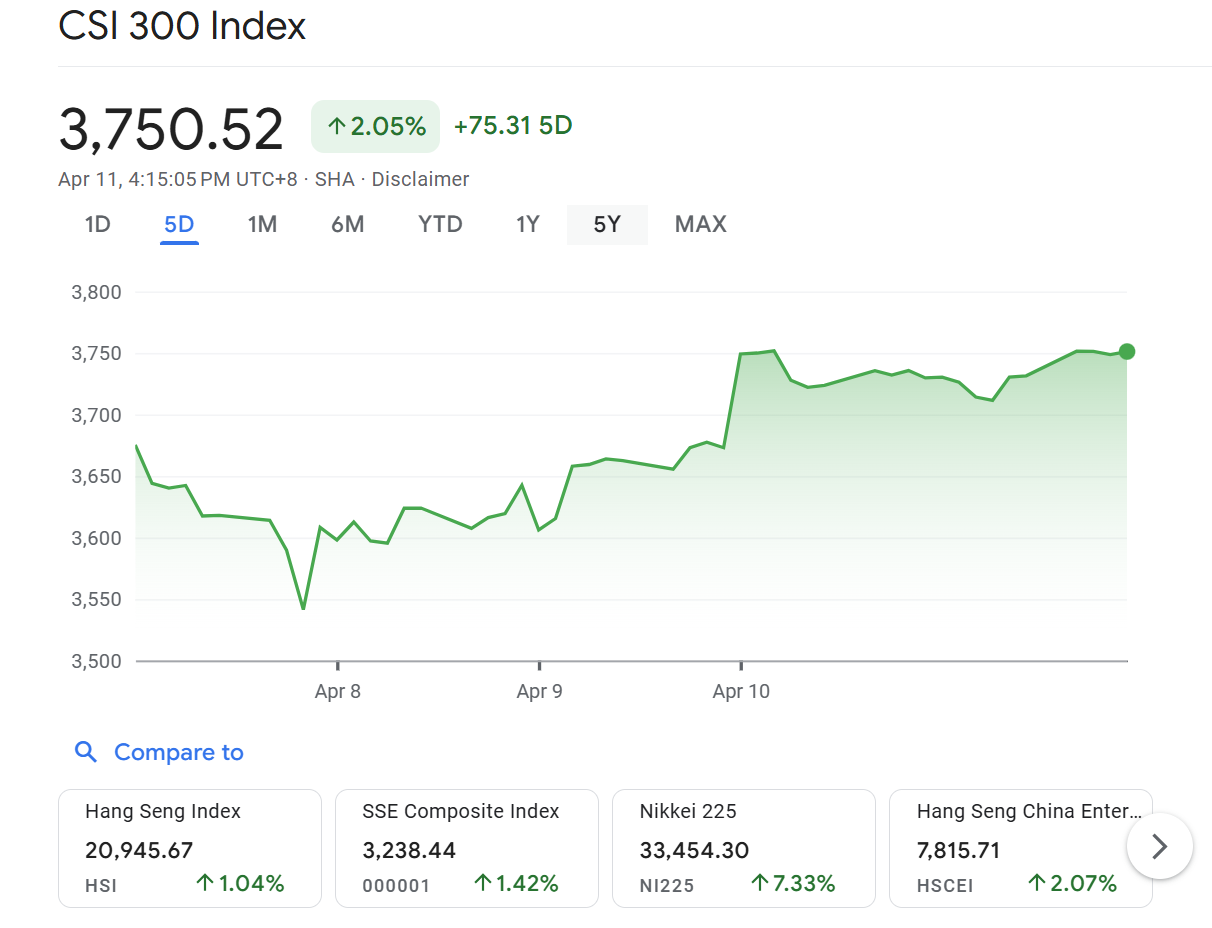 Chứng khoán Trung Quốc hồi sinh ngay sau đó. Chỉ số CSI 300 đã lấy lại đà tăng, trái ngược với mức giảm 7% hôm 7/4. Đây là chỉ số chứng khoán tính theo giá trị vốn hóa thị trường của 300 cổ phiếu loại A được giao dịch trên sàn giao dịch chứng khoán Thượng Hải và Thâm Quyến.