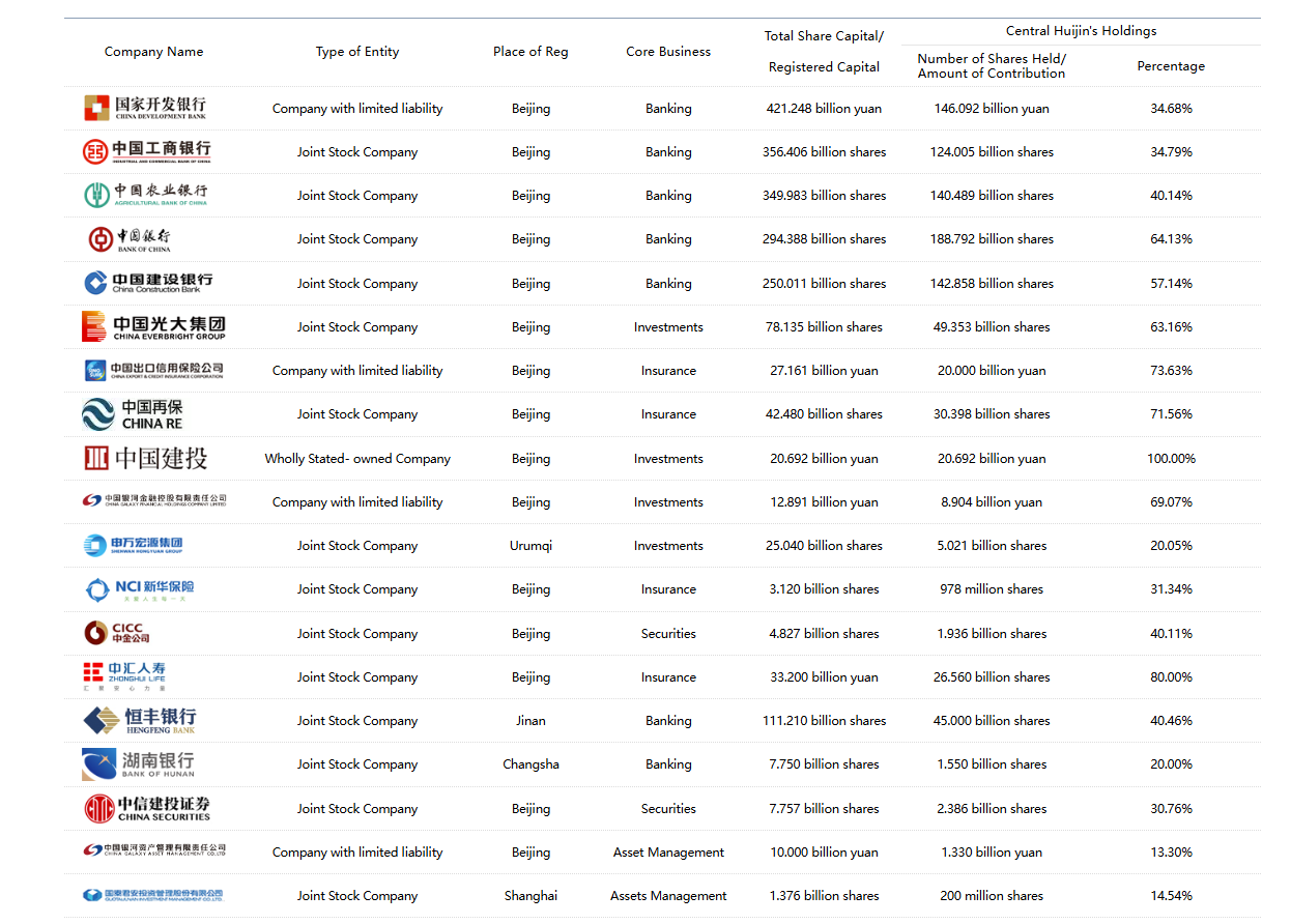 Central Huijin nắm giữ lượng cổ phần đáng kể tại nhiều định chế tài chính Trung Quốc