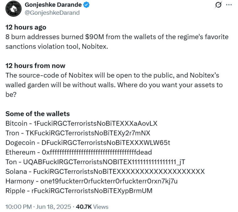 Thông điệp chính trị: Predatory Sparrow cáo buộc Nobitex là công cụ trọng yếu của chính quyền Iran để tài trợ khủng bố toàn cầu và né tránh trừng phạt. Họ đe dọa công bố mã nguồn và dữ liệu nội bộ của Nobitex trong vòng 24 giờ, đồng thời cảnh báo người dùng rút tài sản khỏi sàn để tránh rủi ro.