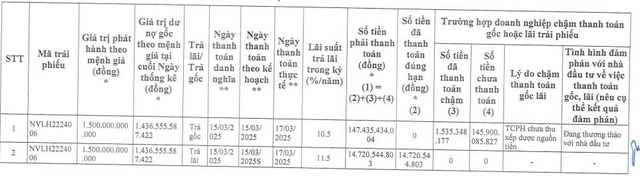 Cụ thể, theo kết hoạch ban đầu, CTCP Tập đoàn Đầu tư Địa ốc Nova (Novaland, mã CK: NVL) phải thanh toán gần 162,2 tỷ đồng tiền gốc và lãi của lô trái phiếu mã NVLH2224006 ngày 15/3/2025. Tuy nhiên, đến 17/3, Novaland mới chỉ thanh toán đúng hạn hơn 14,7 tiền lãi và đã thanh toán chậm hơn 1,5 tỷ đồng tiền gốc của lô trái phiếu này.