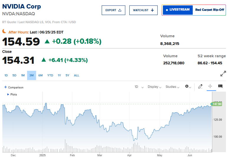 Cổ phiếu Nvidia bật tăng hơn 4% trong phiên giao dịch ngày 25/6, lập đỉnh mới tại 154,59 USD, đẩy vốn hóa vượt 3,77 nghìn tỷ USD.