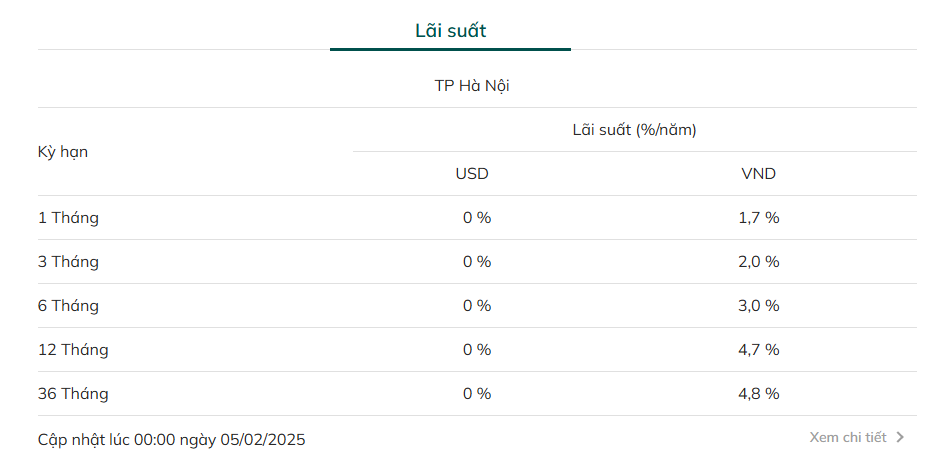 Lãi suất tiết kiệm tại quầy kỳ hạn 1 tháng – 2 tháng cũng không thay đổi, vẫn được niêm yết 1,7%/năm.