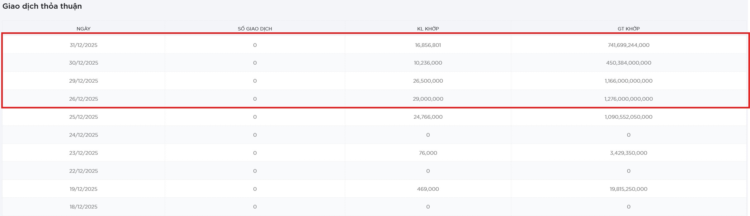Đáng chú ý, trong 4 phiên giao dịch gần nhất (từ 26/12 – 31/12/2025), cổ phiếu LPB xuất hiện loạt giao dịch thỏa thuận quy mô lớn, với tổng khối lượng lên tới 82,5 triệu đơn vị - đúng bằng số cổ phiếu ông Thụy từng sở hữu.