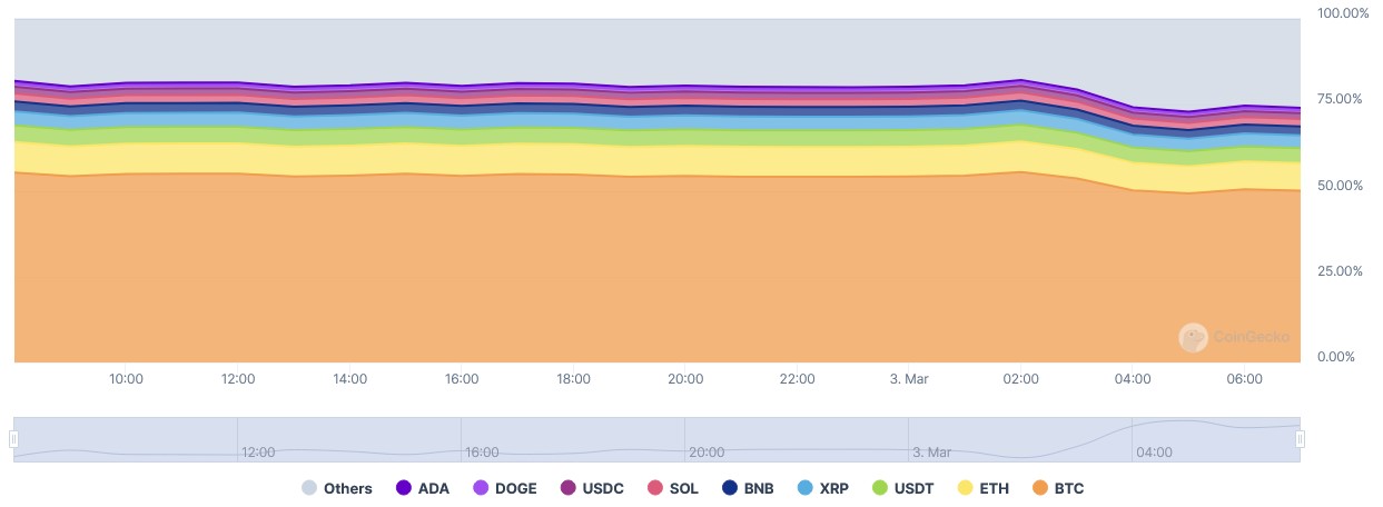 Bitcoin Dominance (ưu thế thống trị của BTC) đã tụt xuống 49,6% - lần đầu tiên mất mốc 50% sau khi Tổng thống Donald Trump công bố kế hoạch xây kho dự trữ crypto - trong đó không chỉ Bitcoin mà còn XPR, Solana và Cardano.