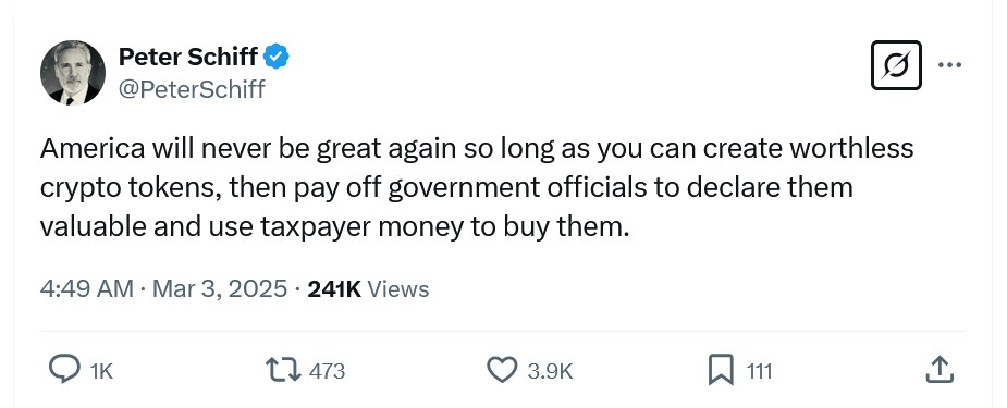 Ngay cả ông Peter Schiff - một người anti Bitcoin lâu năm - đã thừa nhận rằng Bitcoin được xem như vàng kỹ thuật số và nếu Mỹ dự trữ vàng thì cũng có thể dự trữ Bitcoin.