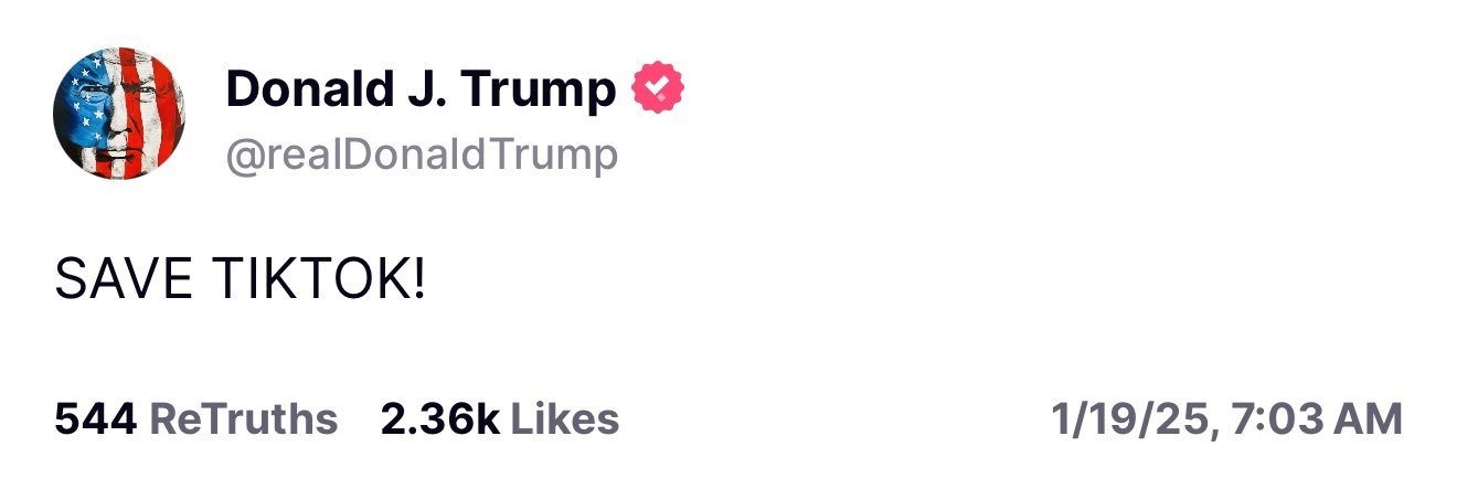 Ứng dụng cũng không quên nhắc đến ông Trump, khi họ cho biết vị tân tổng thống sẽ làm việc với công ty để tìm ra giải pháp khôi phục nền tảng sau lễ nhậm chức. Trên mạng xã hội Truth Social do chính ông Trump sáng lập, tài khoản của vị tổng thống băng bài với nội dung ngắn gọn "Cứu TikTok".