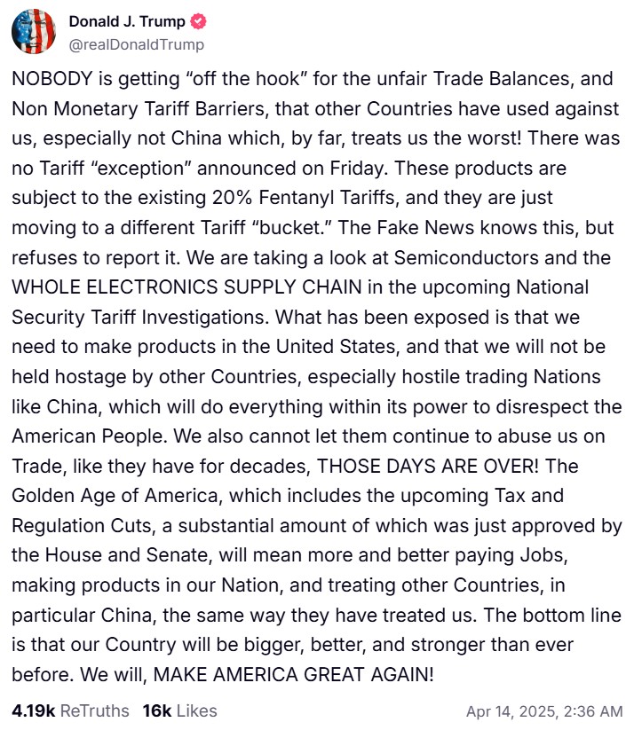 Tuy nhiên, ông Trump nhấn mạnh đây không phải là “ngoại lệ” thực sự. “Các sản phẩm đó vẫn đang chịu mức ‘thuế fentanyl’ 20% hiện tại, chỉ là chúng được chuyển sang nhóm thuế khác mà thôi. Truyền thông tin giả biết điều này, nhưng lại không đưa tin”, ông Trump cho hay.