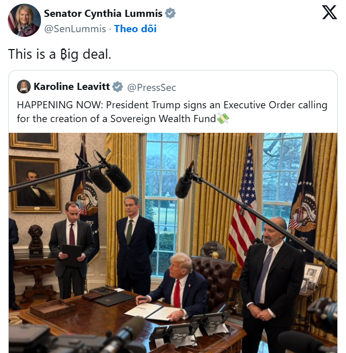 Thượng nghị sĩ Cynthia Lummis - một trong những quan chức ủng hộ Bitcoin - cũng nhắc tới Bitcoin khi chia sẻ lại thông tin này. "Đây là một ₿ig deal", bà viết trên X, sử dụng ký hiệu "₿" của Bitcoin, ngụ ý đây là bước ngoặt lớn cho thị trường.