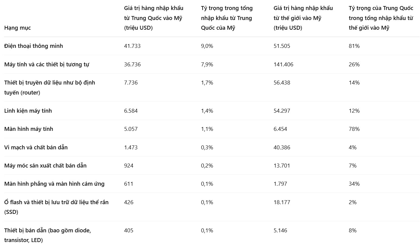 Danh mục miễn trừ bao gồm các sản phẩm như: Điện thoại thông minh (smartphone), máy tính xách tay (laptop), ổ cứng, bộ vi xử lý, chip nhớ, màn hình phẳng, thiết bị sản xuất chip và cả USB, thẻ nhớ – những linh kiện công nghệ mà Mỹ hầu như không còn sản xuất trong nước.