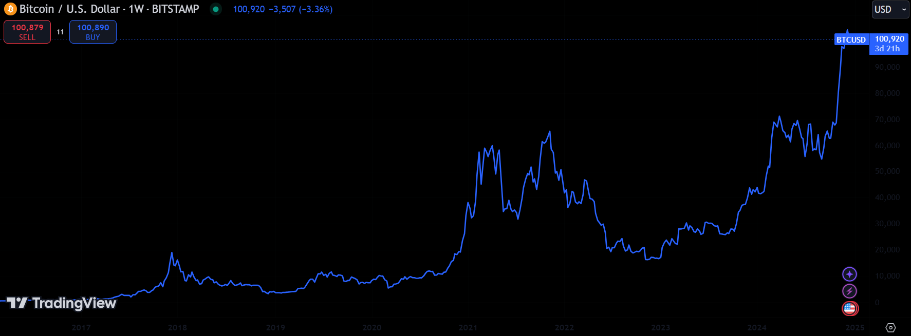 Bitcoin trượt xuống ngưỡng 100.000 USD, giảm gần 5% trong 24 giờ qua (Nguồn: TradingView)