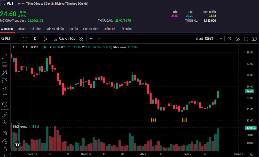 Kết phiên 19/2, cổ phiếu PET đóng cửa ở mức 24.600 đồng/cp, tăng 3,14% so với tham chiếu. Khối lượng giao dịch khớp lệnh đạt 1,18 triệu đơn vị - cao nhất kể từ phiên 14/11/2024. Trong 3 tháng qua, thanh khoản bình quân của PET chỉ đạt khoảng 400.000 cổ phiếu/phiên.