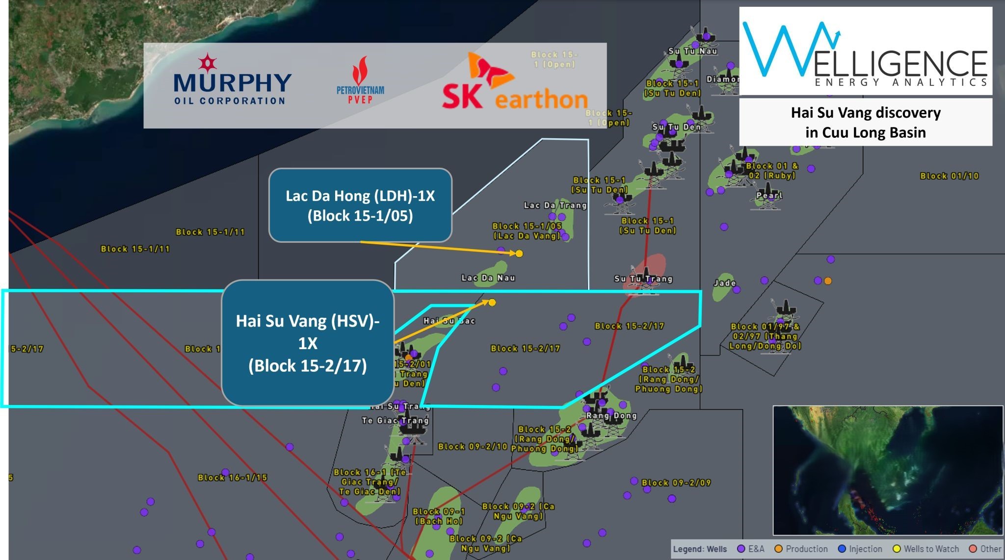 Tại lô này, Murphy Oil của Mỹ nắm giữ 40% cổ phần, PVEP (Tổng công ty Thăm dò Khai thác Dầu khí Việt Nam) sở hữu 35%, và SK Earthon của Hàn Quốc có 25%.