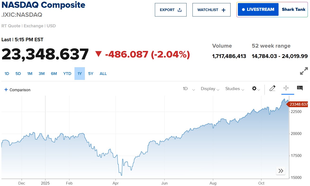 Chốt phiên, chỉ số S&P 500 mất 1,17%, xuống 6.771,55 điểm; Nasdaq Composite giảm 2,04%, còn 23.348,64 điểm; trong khi Dow Jones rớt 251,44 điểm (tương đương 0,53%), dừng tại 47.085,24 điểm.