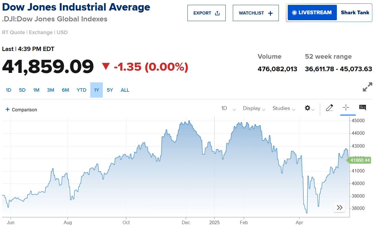 Chốt phiên 22/5, chỉ số Dow Jones giảm nhẹ 1,35 điểm xuống còn 41.859,09 điểm. S&P 500 lùi 0,04% về 5.842,01 điểm, trong khi Nasdaq Composite tăng 0,28% lên 18.925,73 điểm.