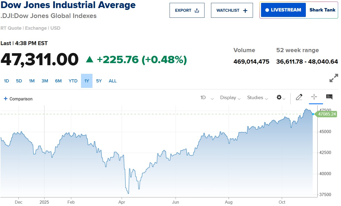 Chốt phiên, chỉ số Dow Jones tăng 225,76 điểm (0,48%) lên 47.311,00 điểm. S&P 500 cộng 0,37% lên 6.796,29 điểm, còn Nasdaq Composite tăng 0,65% lên 23.499,80 điểm.