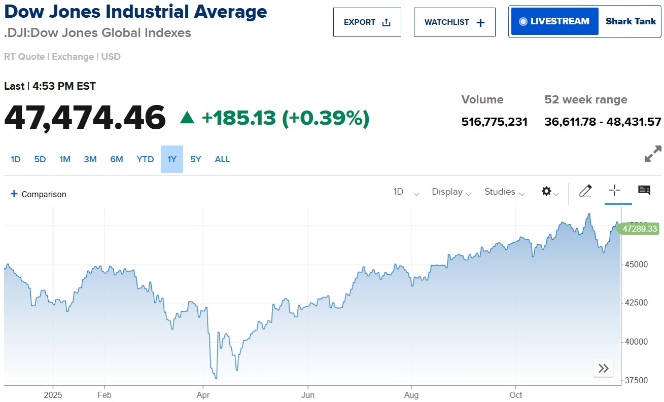Kết phiên, chỉ số Dow Jones tăng 185,13 điểm (0,39%) lên 47.474,4 điểm; S&P 500 tăng 0,25% lên 6.829,37 điểm; còn Nasdaq Composite tăng 0,59% lên 23.413,67 điểm.