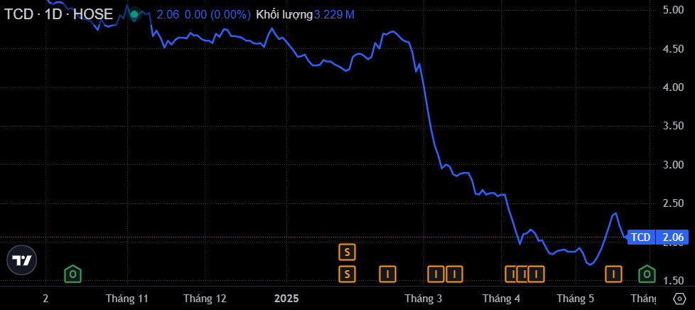 Theo đó, cổ phiếu TCD đã bắt đầu đà giảm từ cuối tháng 2, đặc biệt sau thông tin tiêu cực liên quan đến việc bà Huỳnh Thị Kim Tuyến - Phó Chủ tịch HĐQT - bị khởi tố, khiến thị giá mã này "rơi" một mạch từ 4.700 đồng/cp xuống còn 1.700 đồng/cp - mức thấp nhất lịch sử.