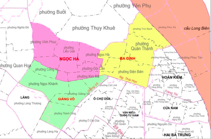 Quận Ba Đình từ 13 phường còn 3 phường, gồm phường Ba Đình, Ngọc Hà và Giảng Võ.