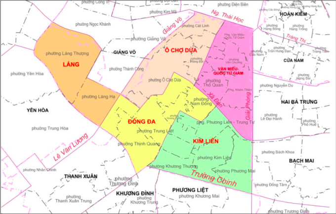Quận Đống Đa từ 17 phường còn 5 phường, gồm Đống Đa, Kim Liên, Văn Miếu - Quốc Tử Giám, Ô Chợ Dừa.