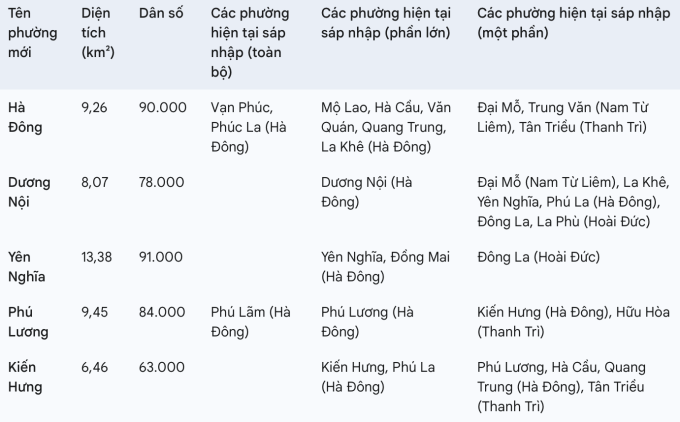 Quận Hà Đông từ 15 phường còn 5, gồm Hà Đông, Dương Nội, Yên Nghĩa, Phú Lương và Kiến Hưng.