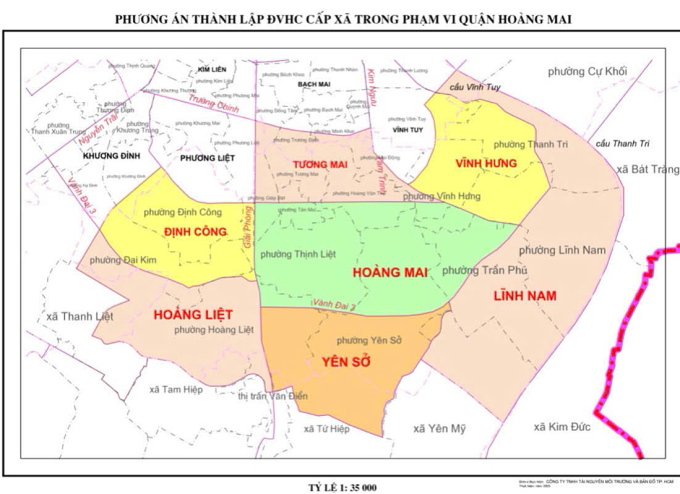 Quận Hoàng Mai từ 14 phường còn 7, gồm Hoàng Mai, Vĩnh Hưng, Tương Mai, Định Công, Hoàng Liệt, Yên Sở, Lĩnh Nam.