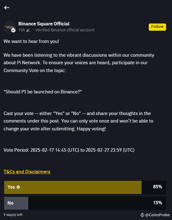 85% người dùng bỏ phiếu để Binance niêm yết PI (Nguồn: CoinsProbe)