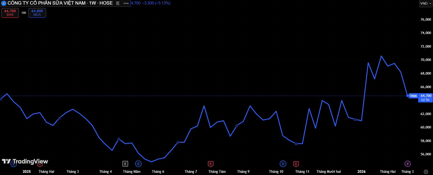 Diễn biến giá cổ phiếu VNM trên thị trường (Nguồn: TradingView)