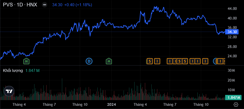 Trên thị trường chứng khoán, sau khi thiết lập đỉnh lịch sử ở mức 44.950 đồng/cp tại phiên 23/5, cổ phiếu PVS đang liên tục ghi nhận những phiên điều chỉnh và đã giảm tổng cộng 23,6%. Kết phiên 9/12, cổ phiếu PVS đóng cửa ở mức 34.300 đồng/cp, tăng 1,18% so với tham chiếu./.