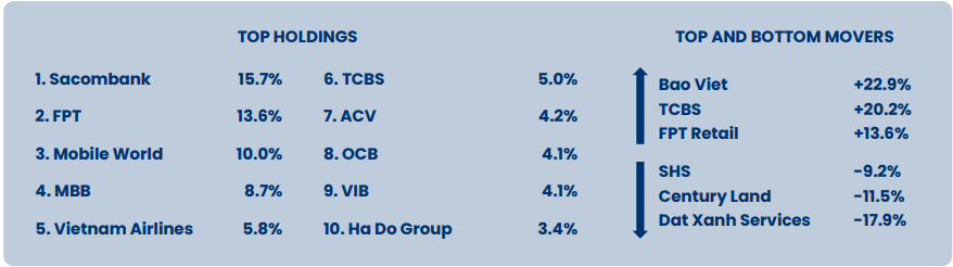 Theo báo cáo, kết quả trên đạt được nhờ đà đi lên của 4 cổ phiếu, gồm STB, FPT, TCX và MBB. Trong cơ cấu danh mục của PYN, STB hiện là khoản đầu tư lớn nhất với tỷ trọng 15,7%, tiếp theo là FPT chiếm 13,6%, MWG chiếm 10% và MBB chiếm 8,7%. TCX đứng thứ sáu với tỷ trọng khoảng 5%.