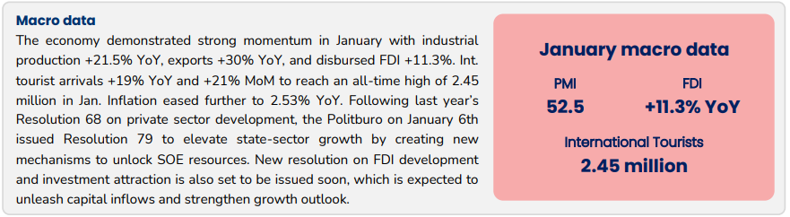Thanh khoản thị trường chứng khoán tháng 1/2026 cải thiện đáng kể, với giá trị giao dịch bình quân phiên tăng 47% so với tháng trước. Một loạt chỉ số kinh tế cũng ghi nhận mức tăng cao, gồm sản xuất công nghiệp, xuất khẩu, giải ngân FDI và lượng khách quốc tế. Lạm phát duy trì ở mức thấp, quanh 2,5% so với cùng kỳ.