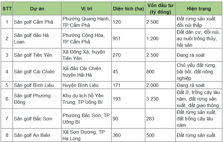 Dự án có quy mô lớn nhất là sân golf đảo Hà Loan tại phường Cộng Hòa, TP Cẩm Phả với diện tích 951 ha, tổng vốn đầu tư 1.200 tỷ đồng. Theo sau là các dự án như sân golf Cẩm Phả - diện tích 120ha, tổng vốn đầu tư 2.500 tỷ đồng hay sân golf Tiên Yên - diện tích 270 ha, tổng vốn đầu tư 2.500 tỷ đồng ...
