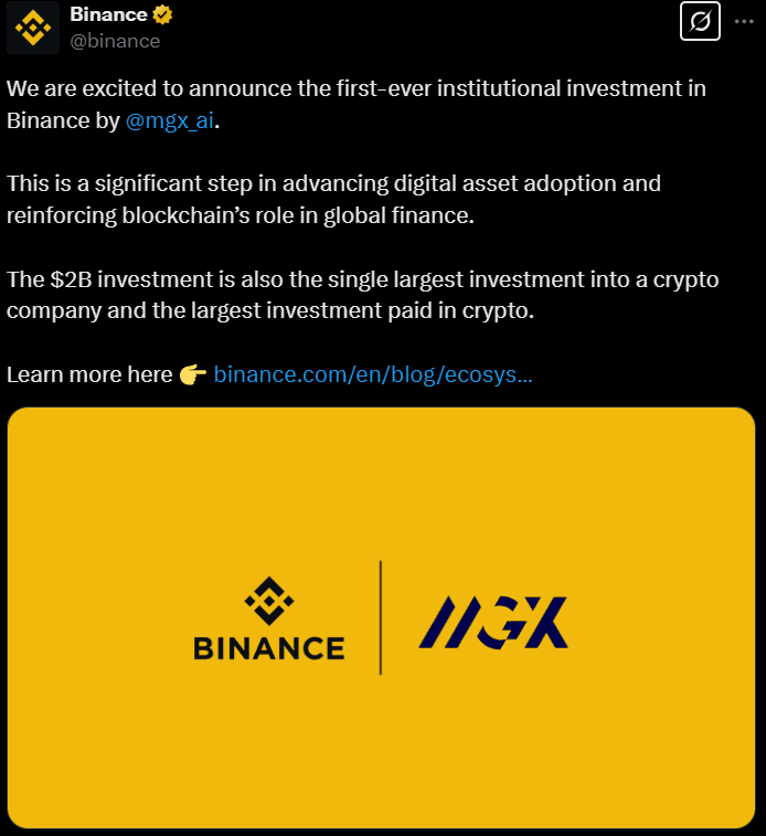 Quỹ đầu tư MGX của Abu Dhabi rót 2 tỷ USD vào Binance, đánh dấu một trong những thương vụ lớn nhất trong lịch sử ngành tài sản số.