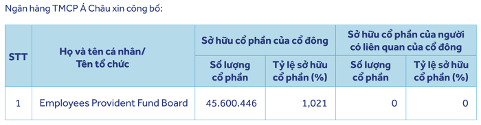Cụ thể, tính đến 21/5, EPF đang sở hữu hơn 45,6 triệu cổ phiếu ACB, tương ứng tỷ lệ sở hữu ở mức 1,021% vốn điều lệ của ngân hàng.