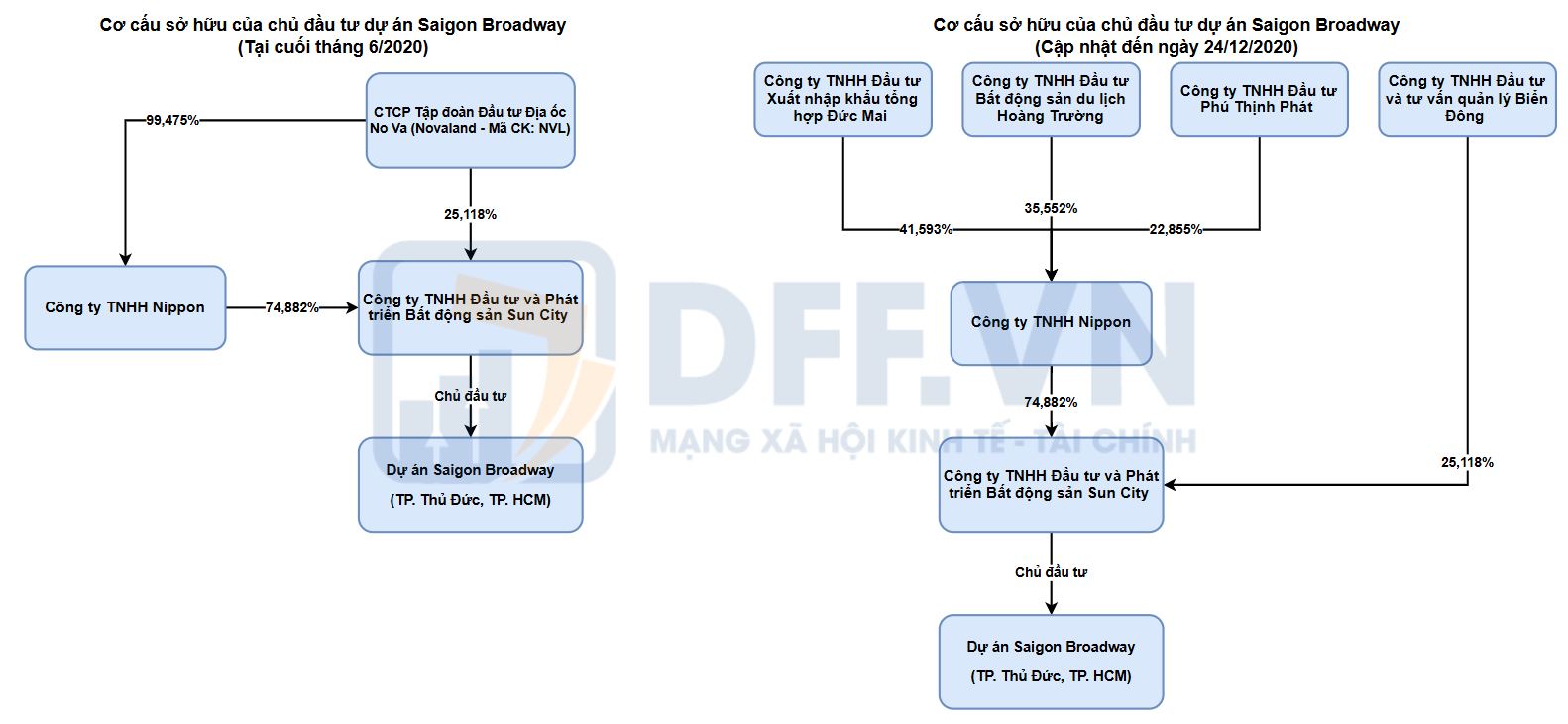Theo đó, Công ty TNHH Đầu tư và tư vấn quản lý Biển Đông (Biển Đông Invest) trực tiếp nắm giữ 25,118% cổ phần Sun City. Phần vốn còn lại của doanh nghiệp dự án Saigon Broadway, tương ứng 74,882% cổ phần, do Công ty TNHH Nippon (Nippon) sở hữu.