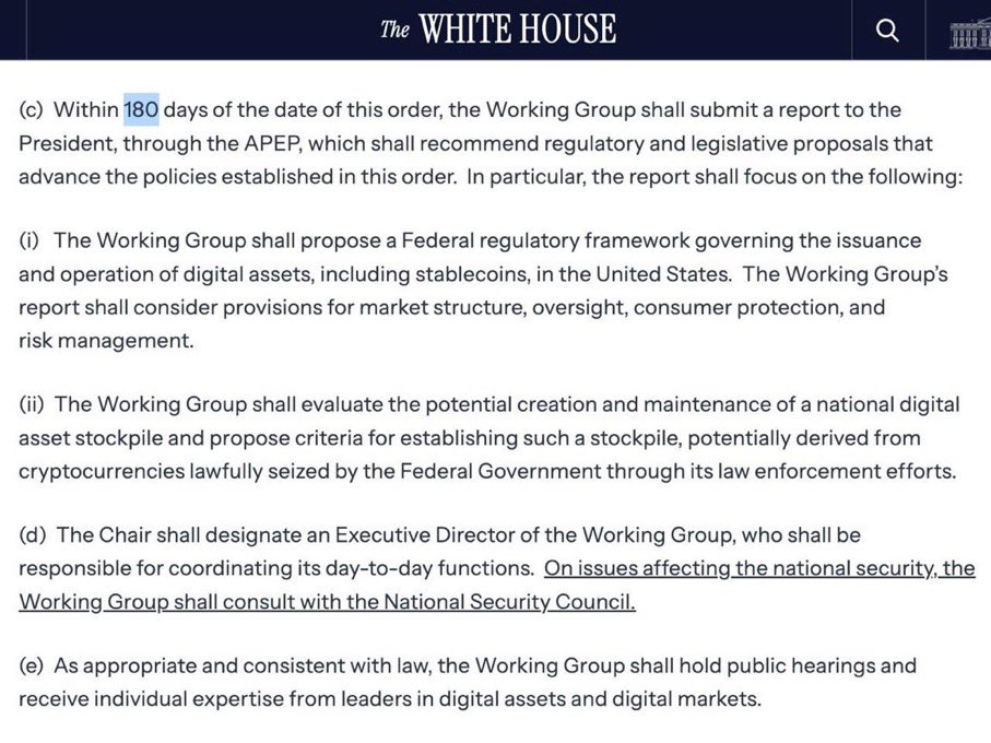Theo phóng viên Eleanor Terrett, Nhà Trắng cho biết báo cáo trên sẽ được công bố vào ngày 22/7 hoặc muộn nhất là "trước khi tháng 7 kết thúc". Tài liệu này do "Nhóm Công tác Tài sản Số" thực hiện, dưới sự dẫn dắt của ông David Sacks và Bo Hines, sau nhiều tháng phối hợp giữa các cơ quan liên bang.