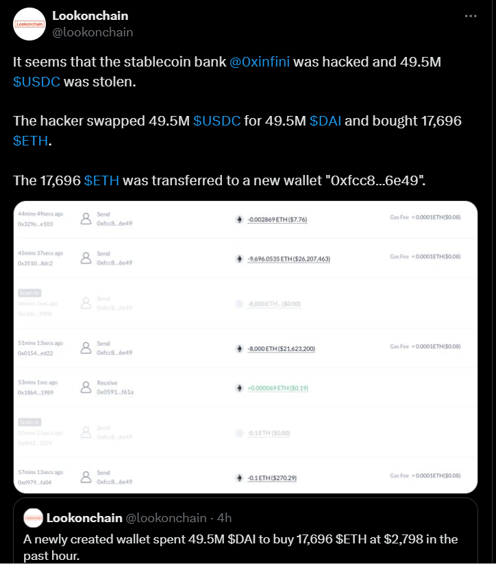 - Theo phân tích dữ liệu Lookonchain, hacker đã swap 49,5 triệu USDC sang 49,5 triệu DAI, sau đó tiếp tục swap số DAI này sang 17.696 ETH. Hiện toàn bộ số ETH này đã được chuyển sang địa chỉ ví mới.