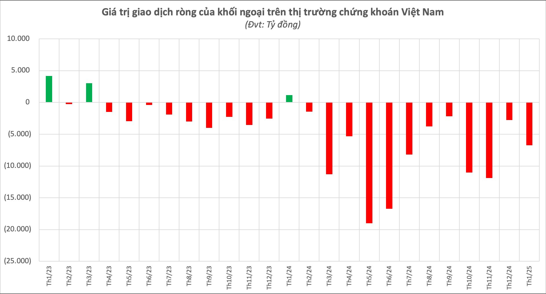 Không chỉ điểm số ảm đạm, chứng khoán Việt Nam còn chịu áp lực bán ròng mạnh từ khối ngoại. Sau năm bán ròng kỷ lục hơn 93.000 tỷ đồng trên toàn thị trường, nhóm nhà đầu tư nước ngoài tiếp tục bán ròng mạnh tay trên diện rộng trong tháng 1/2025, giá trị bán ròng trên toàn sàn đạt 6.754 tỷ đồng. Đây là tháng thứ 12 liên tiếp khối ngoại bán ròng trên toàn sàn.