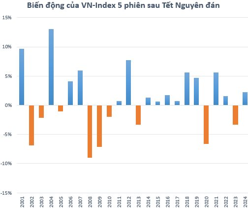 Theo thống kê, chứng khoán Việt Nam có xác suất tăng điểm cao hơn với 15 năm, số lần giảm là 9. Trong 10 năm gần nhất, xác suất để chỉ số chính của TTCK Việt Nam tăng điểm sau Tết Nguyên đán lên đến 80%.
