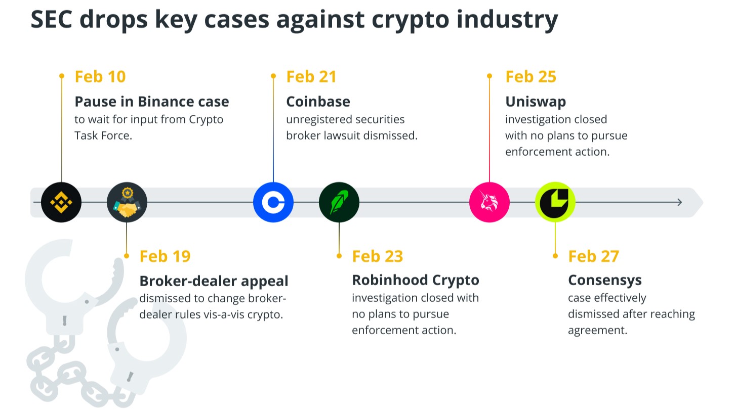 Chỉ nội trong tháng 2, Ủy ban Chứng khoán và Giao dịch Hoa Kỳ (SEC) đã tạm dừng hoặc hủy bỏ 6 vụ kiện lớn chống lại các sàn giao dịch và giao thức DeFi, đánh dấu bước ngoặt trong cách tiếp cận quản lý tiền điện tử.