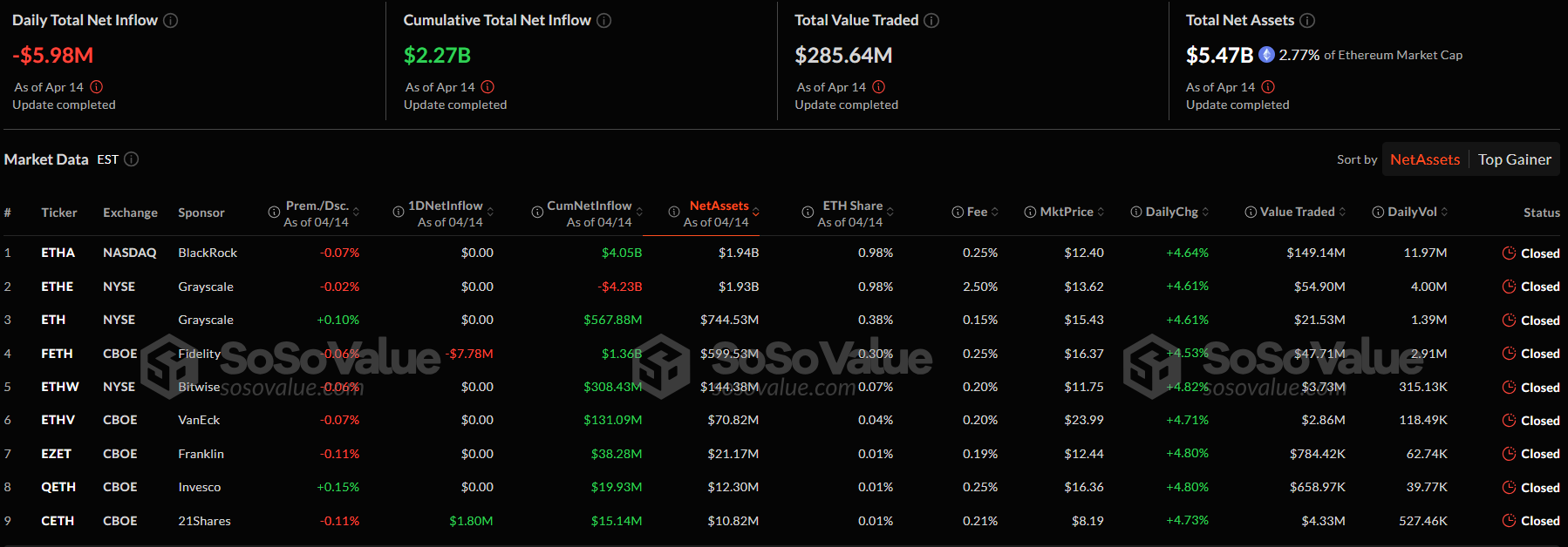 Tính đến ngày 11/4, các quỹ ETF Ether chỉ thu hút 2,2 tỷ USD dòng vốn ròng kể từ khi ra mắt đầu năm 2024. Trong khi đó, ETF Bitcoin đã mang về tới 35,4 tỷ USD, theo số liệu từ Sosovalue.