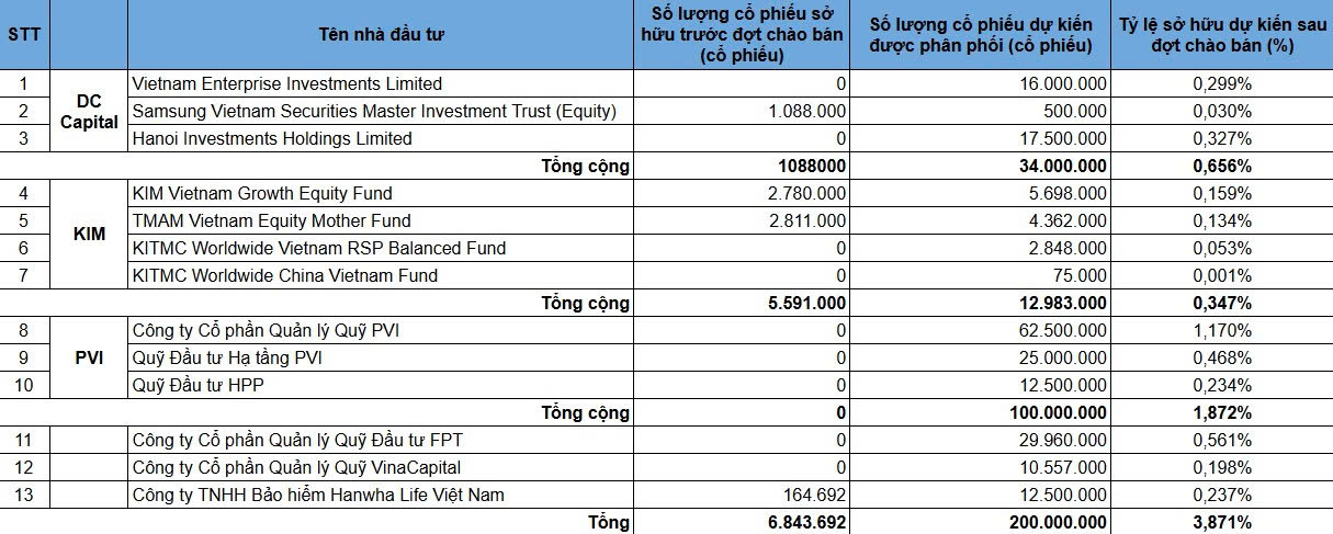Ngoài ra, danh sách nhà đầu tư còn có sự tham gia của nhiều tổ chức tài chính khác như CTCP Quản lý Quỹ Đầu tư FPT (dự kiến mua gần 30 triệu cổ phiếu), CTCP Quản lý Quỹ VinaCapital (10,5 triệu cổ phiếu) và Công ty TNHH Bảo hiểm Hanwha Life Việt Nam (12,5 triệu cổ phiếu).