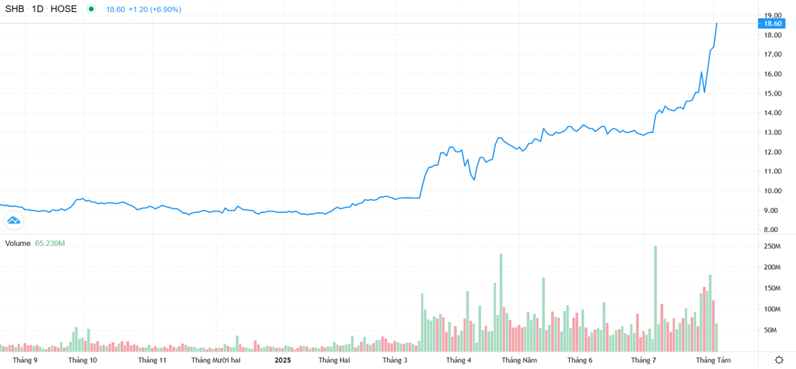 SHB ghi nhận nhiều phiên giao dịch trên 100 triệu cổ phiếu, dẫn đầu nhóm VN30 và ngành ngân hàng. Đặc biệt, ngày 7/7, SHB có phiên giao dịch kỷ lục gần 250 triệu cổ phiếu. SHB cũng là mã cổ phiếu nhận được sự thu hút của khối ngoại với khối lượng mua ròng hơn 100 triệu đơn vị trong tháng 7 vừa qua.