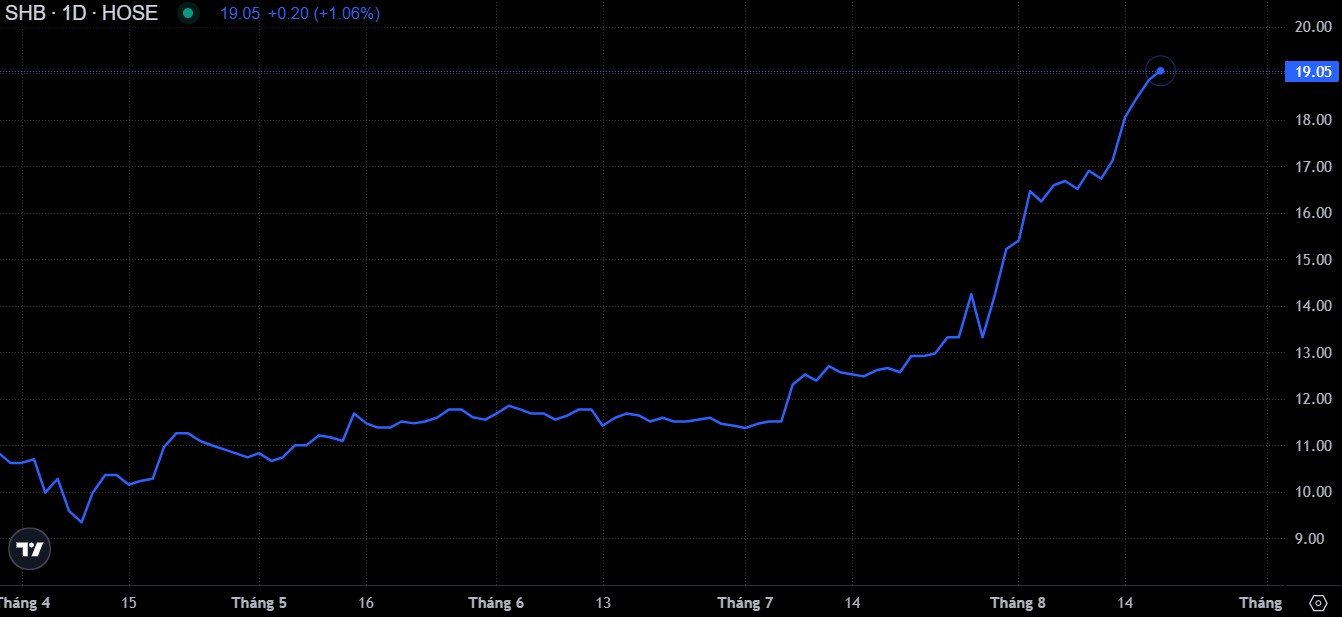 Động thái thoái bớt vốn diễn ra trong bối cảnh cổ phiếu SHB ghi nhận đà tăng mạnh kể từ đầu tháng 7. Từ mức giá quanh 12.850 đồng/cổ phiếu, SHB đã bứt phá lên 20.850 đồng/cổ phiếu (đã điều chỉnh) vào ngày 15/8 – tương đương mức tăng hơn 1,6 lần. Kết phiên 18/8, SHB đóng cửa tại mức 18.850 đồng/cổ phiếu. Ước tính theo giá này, SHS có thể thu về khoảng 377 tỷ đồng từ thương vụ thoái vốn.