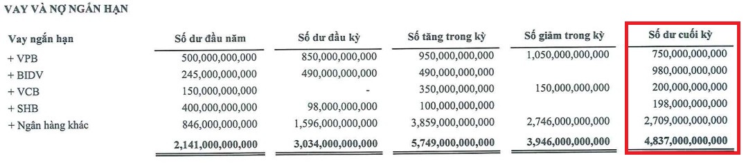 Theo báo cáo tài chính quý 2/2025, tại ngày 30/6, SHS đang vay ngắn hạn 4.837 tỷ đồng, bao gồm các khoản vay tại VPB (750 tỷ đồng), BIDV (980 tỷ đồng), Vietcombank (200 tỷ đồng), SHB (198 tỷ đồng) và vay ngân hàng khác (2.709 tỷ đồng), tăng gấp 2,2 lần so với thời điểm cuối năm 2024.