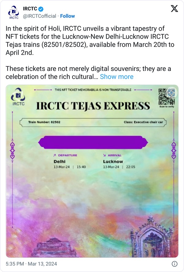 Indian Railways từng thử nghiệm phát hành vé NFT vào tháng 3/2024 nhân dịp lễ hội Holi của người Hindu. Những tấm vé này không chỉ là kỷ vật số mà còn tôn vinh bản sắc văn hóa phong phú của các thành phố như Lucknow và Delhi.
