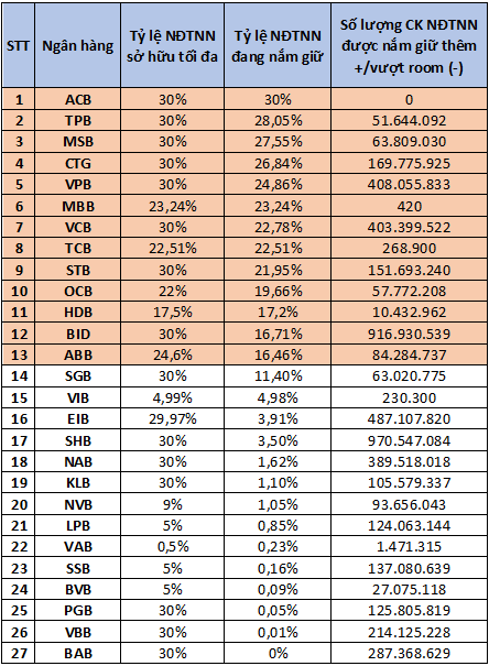 Trong đó, nhiều ngân hàng đã kín hoặc gần kín "room" ngoại như ACB, TPBank, MSB, VietinBank, MB, Techcombank, OCB, HDBank, với tỷ lệ sở hữu nhà đầu tư nước ngoài được phép mua thêm dưới 5% vốn ngân hàng.