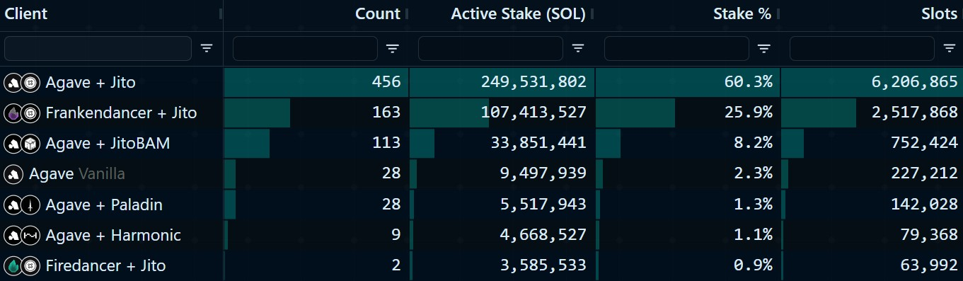 Dữ liệu cho thấy khoảng 165 validator, đại diện cho khoảng 26% tổng lượng SOL được stake, đang vận hành Frankendancer song song với client Agave hiện tại.
