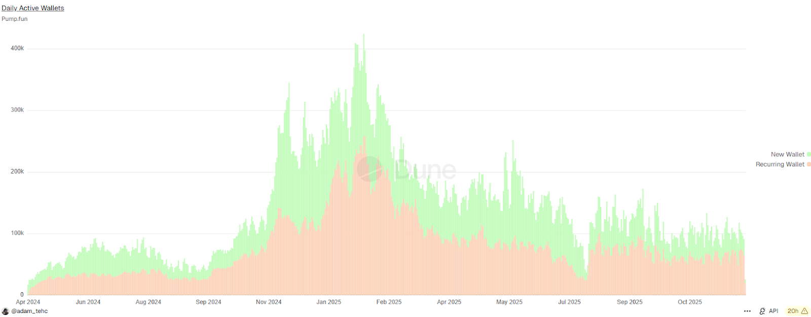 Hoạt động của các ví trên nền tảng phát hành token Pump.fun cho thấy sự gia tăng mạnh của memecoin trên mạng lưới Solana (Nguồn: Dune Analytics)