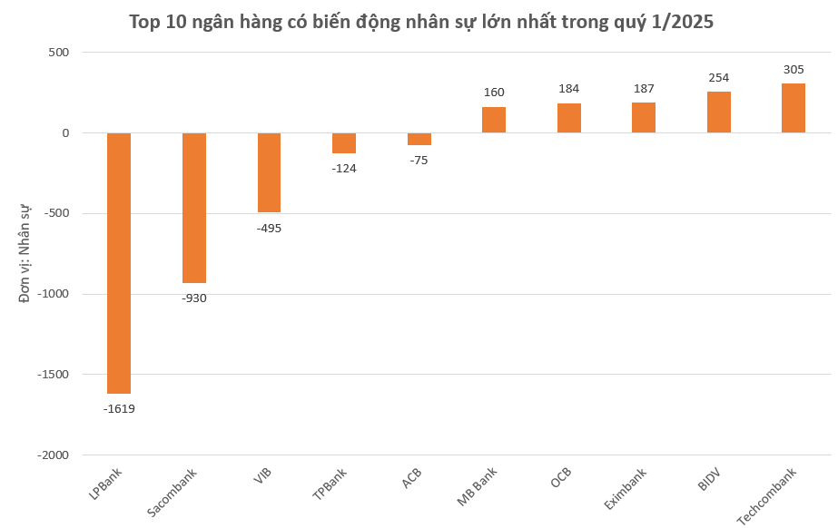 Làn sóng tinh giản nhân sự lan rộng trong ngành ngân hàng đầu năm 2025, với hàng loạt nhà băng mạnh tay cắt giảm hàng trăm đến cả nghìn lao động. Trong dó, LPBank gây chú ý khi giảm hơn 1.600 người chỉ trong quý 1/2025, theo sau là các ngân hàng như Sacombank, VIB, TPBank...