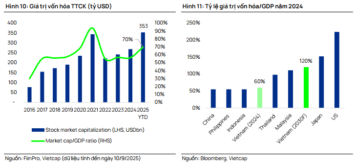 Mục tiêu của Chính phủ là đưa tỷ lệ này lên 120% vào năm 2030, cùng với danh mục niêm yết chất lượng cao hơn, tạo nền tảng cho TTCK Việt Nam tăng trưởng dài hạn, theo VietCap.